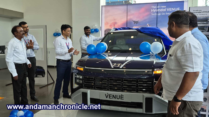 Sri Vijaya Puram, Nov. 16: The all new Hyundai Venue was launched in the Islands on 15th Nov. 2025 in the LMS Hyundai Showroom, Sippighat. Shri Pradeep Kumar, Chief Manager, SME Branch, State Bank of India graced the occasion as the chief guest and formally launched the car.