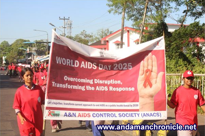 Sri Vijaya Puram, Dec. 1: The Andaman & Nicobar AIDS Control Society (ANACS) observed World AIDS Day 2025 today, with a large-scale awareness rally, drawing enthusiastic participation from school and college students. The event aimed to promote awareness on HIV & AIDS and reaffirm commitments toward eliminating stigma and discrimination.