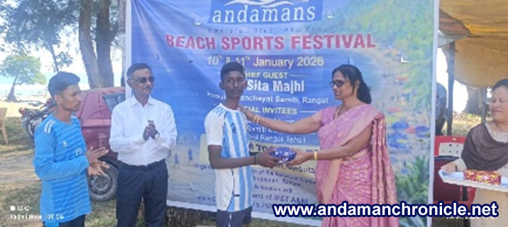 Rangat, Jan. 11: Beach Sports Festival under the calendar of events 2025 – 2026 of A&N Administration was celebrated at the Raman Bagicha Beach, Nimbutala. The sports festival was inaugurated by the Pramukh, Panchayat Samiti Rangat, Ms. Sita Majhi as the chief guest in the presence of Zilla Prishad Members, Panchayat Samiti Members, Pradhans of Rangat Tehsil, Officials of all line departments and a large gathering of general public and visitors. The event is being organized by the office of the Assistant Commissioner, Middle Andaman, Rangat in collaboration with Department of IP&T, A&N Administration. The chief guest also gave away prizes to the winners of the sprint event.
