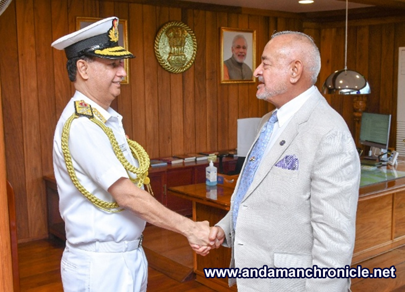 Sri Vijaya Puram, Oct. 8: Vice Admiral Ajay Kochhar, AVSM, NM on assuming charge as the 19th CINCAN, Andaman & Nicobar Command called on Admiral D K Joshi, PVSM, AVSM, YSM, NM, VSM, (Retd.), Hon’ble Lt. Governor, A&N Islands and Vice-Chairman, Islands Development Agency today at Raj Niwas. Discussed perspective plans, force accretion, strategic infrastructure projects in A&N Islands, and strengthening coastal security.