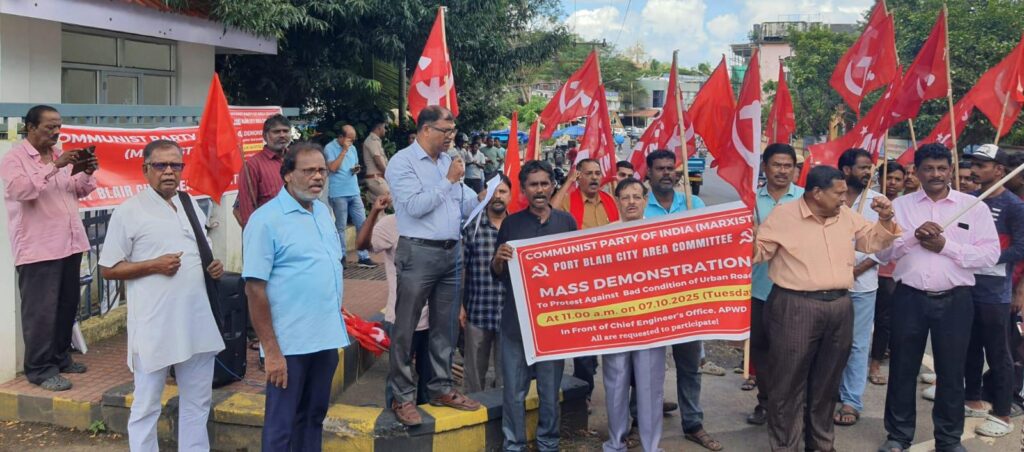 Sri Vijaya Puram, Oct. 8: The Port Blair City Area Committee of CPI (M) has organized a Mass Dharna yesterday (7.10.2025) in front of the Chief Engineer APWD office at Port Blair, to protest against the bad condition of urban roads.  Inaugurating the mass demonstration, D. Ayyappan, State Secretary of CPI (M) criticized the central government for not taking any concrete steps to carry out the repair and renovation of the roads in the islands.   He said that the entire roads in the Municipal area are full of potholes, cracks and uneven surfaces, causing difficulties for the road users.  A number of accidents are occurring in the islands due to the deteriorating condition of the roads.  He blamed the BJP government for not allotting sufficient funds for renovation and repair of these roads.
