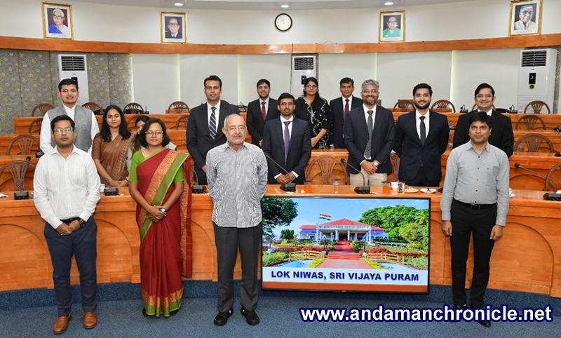 Sri Vijaya Puram, Feb 25: Group of 11 Officers of DANICS Probationers [62nd BATCH] currently on attachment to A&N Islands called on Admiral D K Joshi, PVSM, AVSM, YSM, NM, VSM, (Retd.), Hon’ble Lt. Governor, A&N Islands and Vice-Chairman, Islands Development Agency today at Lok Niwas, Sri Vijaya Puram. Completing their three months tenure at the Islands the Probationers were asked by Hon’ble Lt. Governor to suggest points for infrastructure developmental projects in Tourism, Hospitality and Fisheries sectors & Blue Economy. Officers were also asked to propose ideas on Oil Exploration being carried out at the Andaman Basin. Suggestions put forth by the DANICS Probationers were appreciated by Hon’ble Lt. Governor and suggested for incorporating the same for the mega projects of A&N Administration being steered through Islands Development Agency.