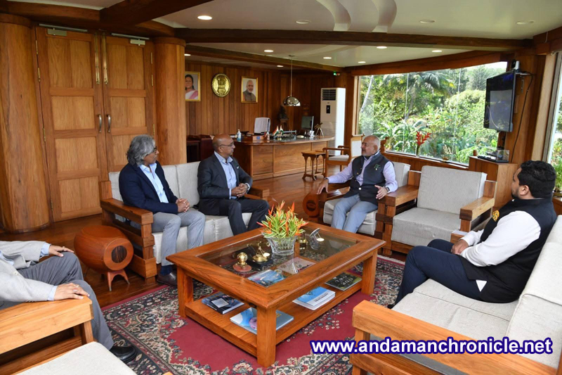 Sri Vijaya Puram, Jan 19: Shri Karan Paul, Chairman, Apeejay Surrendra Group, along with Shri Sumant Ahlawat, CEO, Apeejay Shipping, and Shri Ebrahim Jadwet of Y.E. Jadwet Group, calling on the Honorable Lt. Governor Admiral (retd.) D.K. Joshi, at Lok Niwas, Sri Vijaya Puram.