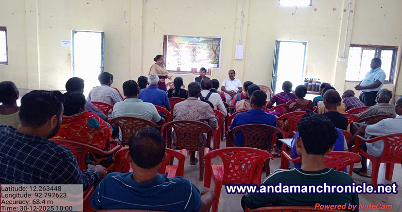 Rangat, Dec. 31: The Department of Agriculture, Rangat organized Awareness programme on ‘Natural Farming’ under National Mission on Natural Farming yesterday in Sundergarh Panchayat for a cluster of 125 farmers of Bejoygarh and Adazig villages. Dr. Jitender Singh, Director (IC), Department of Agriculture and Farmers Welfare, New Delhi, the Additional Nodal Officer of Andaman & Nicobar Islands graced the programme as the chief guest.