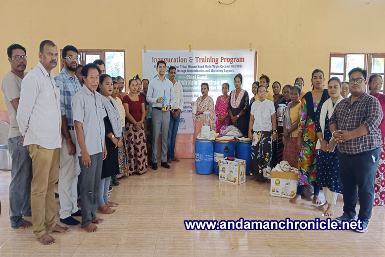 Car Nicobar, Feb. 20: In a landmark initiative to empower tribal women and revolutionize the local coconut economy, a comprehensive training program and workshop was held at the Small Lapathy Community Hall. Kick started by the Deputy Commissioner of Nicobar District, Shri. Amit Kale, IAS, the three-month training and mentoring program aims to equip tribal women producers with modern tools to improve the production and quality of traditional Virgin Coconut Oil (VCO) at home, while strictly maintaining its Geographical Indication (GI) parameters.