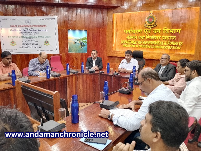 Sri Vijaya Puram, Dec. 18: The District Legal Services Authority, A&N Islands, in association with the Department of Forest, A&N Islands, organised a Legal Awareness Programme today at Van Sadan, Haddo. The programme covered important legal topics, including Indian Forest Act, 1927, Wildlife (Protection) Act, 1972, Forest (Conservation) Act, 1980, Forest Rights Act (FRA), 2006, Compensatory Afforestation Fund Act, 2016 and Prevention of Sexual Harassment (POSH) Act.