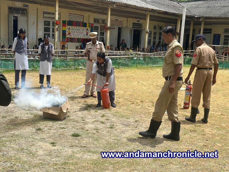 During the drill, participants were briefed on emergency response protocols such as R.A.C.E and P.A.S.S techniques. A simulated earthquake alert was followed by a fire evacuation where students practiced “Duck-Cover-Hold” and safely evacuated to the assembly point. Firefighters also demonstrated the use of portable fire extinguishers and provided hands-on experience to students. The programme concluded with an interactive session on fire safety and disaster preparedness, reaffirming the commitment of A&N Fire & Emergency Service to strengthen disaster preparedness in schools.