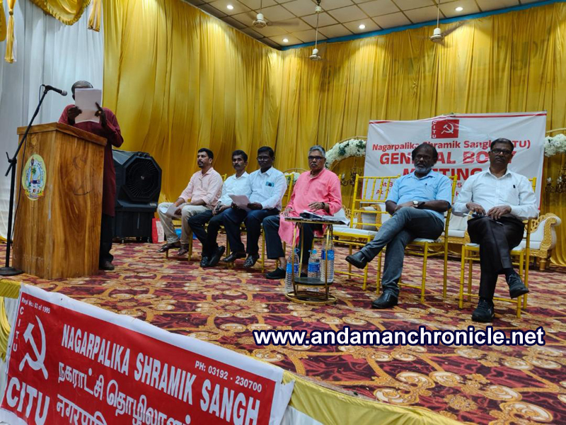 Sri Vijaya Puram, Nov. 23: The General Body meeting of the Nagarpalika Shramik Sangh, Port Blair was held at Tamizhar Sangam Hall, Port Blair today (22.11.2025) afternoon.  In his presidential address, B. Chandrachoodan, President, Nagarpalika Shramik Sangh dealt with briefly the valiant struggles conducted by the daily rated workers in Andaman & Nicobar during the last three decades because of which thousands of workers are getting the 1/30th of pay plus DA benefits.  He emphasized the need to carry forward the struggle for achieving the demand for   regularization of services of daily rated mazdoors.