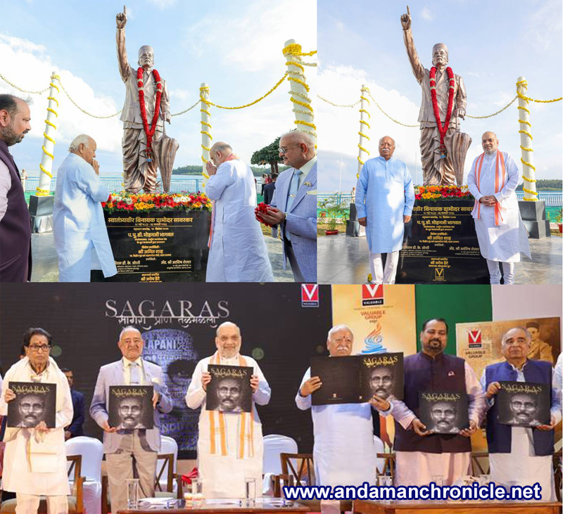 Sri Vijaya Puram, Dec. 12 (PIB): Swatantryaveer Vinayak Damodar Savarkar’s majestic statue was unveiled by Hon. RSS Sarsanghchalak Dr. Mohan Bhagwat ji in the presence of Hon.Home Minister Amit Shah at Beodanabad, Sri Vijaya Puram, Andaman & Nicobar.