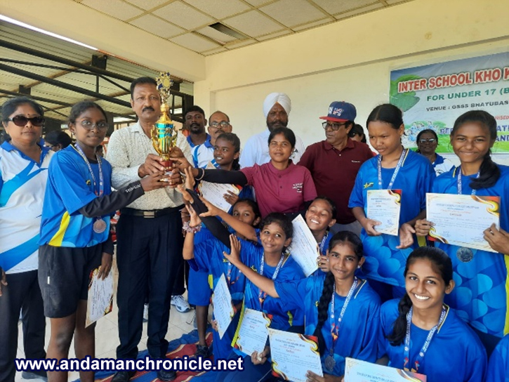 Sri Vijaya Puram, Oct. 19: The Deputy Education Officer, South Andaman organised the Inter School Kho Kho Knockout Tournament of South Andaman Educational Zone. In an exciting final match played for U-17 (Boys), GSS South Point defeated SSS Kamaraj English Medium School by 10-05 while in U-17 (Girls), GSSS Girls defeated SSS Saraswati Shishu Vidhya Mandir by 12-06.
