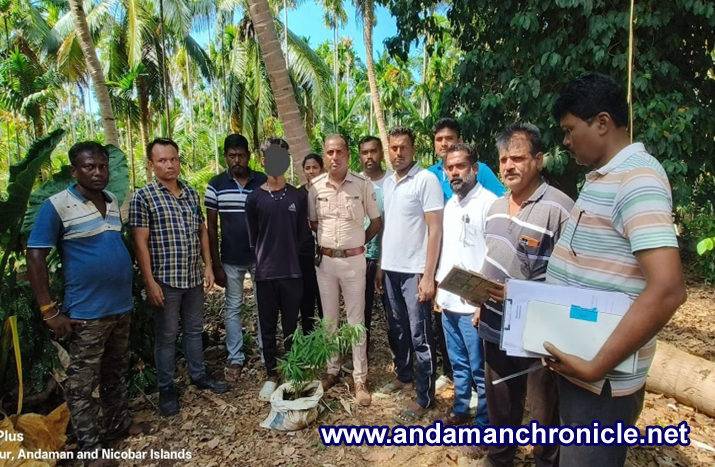 On 22/04/2026, acting on credible information received by Inspector Pritam Behari, SHO, Police Station Hutbay regarding illegal cultivation of cannabis plants in the premises of the residence of Diganta Halder R/o Katai Ward No. 11, R.K Pur, Little Andaman. Upon information, a raiding team was immediately constituted, comprising of Inspr. Pritam Behari, SHO PS Hut Bay, ASI (SG) Victor Dung Dung, D.N. Mishra, HC (SG)s M. Sudarsana Rao, Sarbajit Roy, Manoj Kumar Ekka PC Mohammed Ayub, K. Naresh, T. Naveen, Priya Mandal and Narayan Mondal proceeded towards the location. Further two independent witnesses, namely Shri S. Vijay Kumar (42 yrs), Up-Pradhan, Gram Panchayat Hut Bay and Shri Binoy Das (45 yrs), Pvt. Worker R/o Ongi Tikery, Hut Bay also joined the team. During the search, 08 illicit cannabis plants were recovered from the house backyard of Diganta Halder. Each plant was measured and weighed total 43 grams. All plants were seized and accused Diganta Halder, S/o Late Gobinda Halder (23 yrs) was arrested after observing all codal formalities.