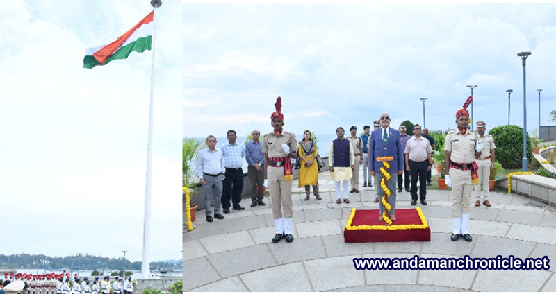 The Hon’ble Lt. Governor, A&N Islands & Vice Chairman, Islands Development Agency, Admiral DK Joshi, PVSM, AVSM, YSM, NM, VSM (Retd.) hoisted the National Tricolor at a solemn function held at Flag Point today. The Chief Secretary, A&N Administration, Dr. Chandra Bhushan Kumar, IAS, DGP, A&N Islands, Shri HGS Dhaliwal, IPS, PCCF, Shri Sanjay Kumar Sinha, IFS, Adhyaksh, ZPSA, Shri Prakash Adhikari, Councillors of SVPMC, Senior Officers of the Administration and general public were present on the occasion.