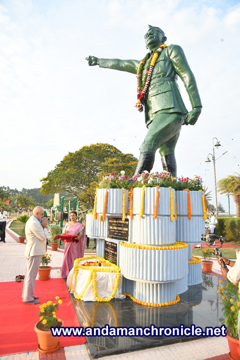 Sri Vijaya Puram, Jan. 23: Admiral D K Joshi, PVSM, AVSM, YSM, NM, VSM (Retd.), Hon’ble Lt. Governor, A&N Islands and Vice Chairman, Islands Development Agency led the Islanders in paying rich tributes to Netaji Subhas Chandra Bose on his 129th Birth Anniversary today. In a function held at the statue of Netaji Subhas Chandra Bose at Marina Park Complex, the Lt. Governor paid floral tributes to Netaji followed by the the Secretary, Ministry of Culture, GoI, Shri Vivek Aggarwal, IAS, Chief Secretary, A&N Administration, Dr. Chandra Bhushan Kumar, IAS, other senior Officers of A&N Administration and general public.