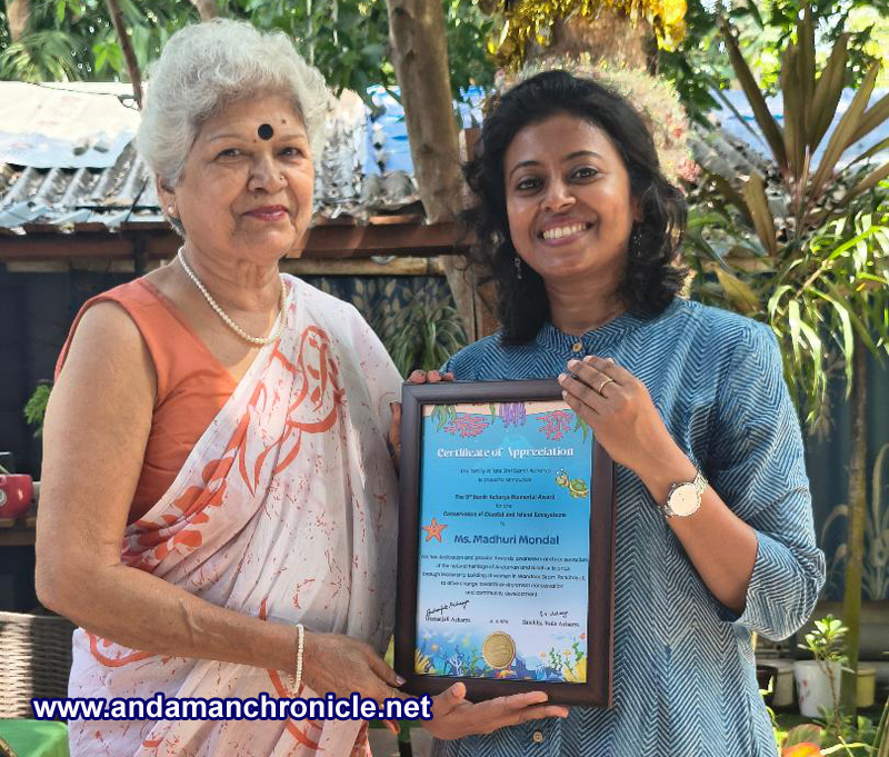 Sri Vijaya Puram, Feb 15: The 5th Samir Acharya Memorial Award for the Conservation of Coastal and Island Ecosystems was today awarded to Ms. Madhuri Mondal, Social Ecologist at Bageecha, Brijgunj Chowk. The ceremony was conducted today, being the birth anniversary of Late Shri. Samir Acharya.