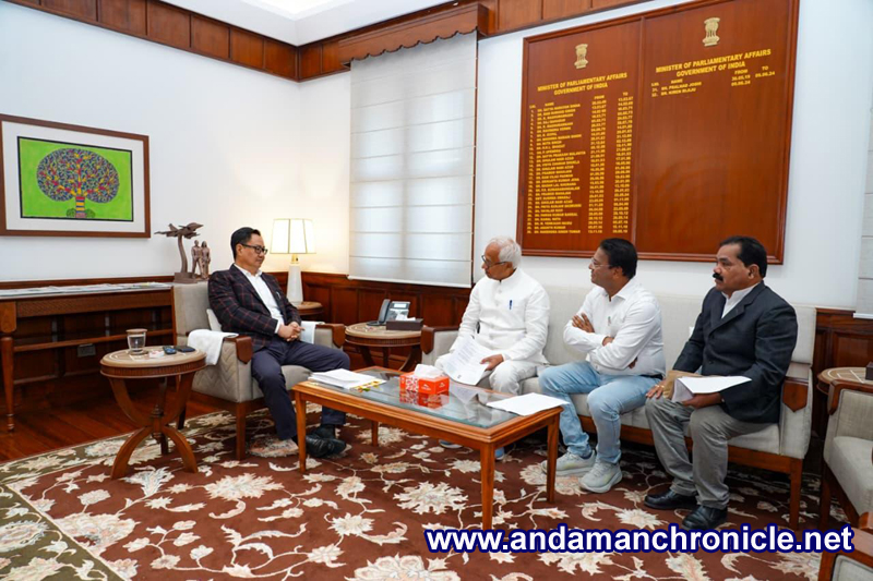Sri Vijaya Puram, Dec. 17: Shri Bishnu Pada Ray, Hon’ble Member of Parliament, Andaman & Nicobar Islands, along with Shri Prakash Adhikari, Adhyaksha, Zilla Parishad, South Andaman District, met Shri Kiren Rijiju, Hon’ble Union Minister for Minority Affairs, at Parliament House today (17.12.2025).