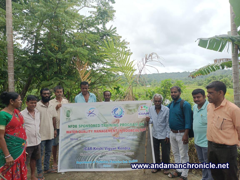 Diglipur, Nov. 3: The ICAR-KVK N&M Andaman (CIARI) organized NFDB Sponsored a five-days training program on “Water Quality Management in Aquaculture” from October29th to 2nd November, 2025, at community hall of Milan Gram of Laxmipur Gram Panchayat, Diglipur. This initiative was designed to inspire and empower rural farming communities in the district to engage in freshwater fish farming, enhancing their understanding of water quality management practices for sustainable aquaculture and broadening economic opportunities. The training program was inaugurated byDr.V. Damodaran (Sr. Scientist& Head) in the presence of Shri. Ashim Mistry, PRI member of Laxmipur Gram Panchayat. In his inaugural address, he highlighted the potential of the aquaculture sector in the North and Middle Andaman district, particularly with Indian major carp species (Catla, Rohu, and Mrigal), to improve food security and generate economic opportunities for local communities. He stressed the need to adopt best practices and advanced technologies to boost productivity and ensure sustainable growth. Asim Mistry expressed his happiness and lauded the efforts of KVK and ICAR- CIARI for organizing such training program for the benefit of farming communities and motivated the farmers and farm women to adopt fish farming practices with scientific manner in their existing farms to get maximum returns.