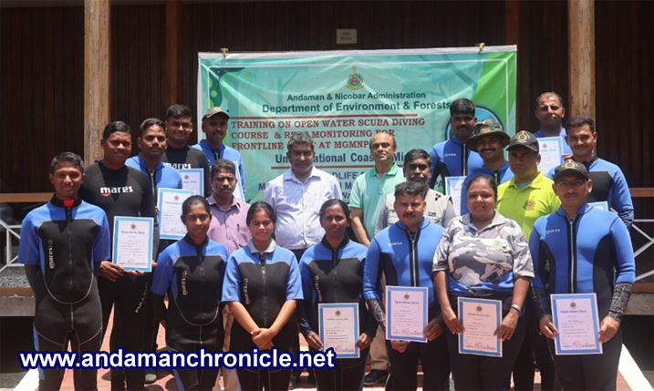 Sri Vijaya Puram, March 27: The Department of Environment & Forests, organised a 1-week Open Water Scuba Diving Course–cum-Reef Monitoring Programme for the frontline staff of the Department at Mahatma Gandhi Marine National Park, Wandoor. The course concluded yesterday with the valedictory programme held at the Interpretation centre of the Marine National Park at Wandoor. The course was conducted under Biosphere Management Programme of National Coastal Mission, Govt. of India with the objective of capacity building of frontline forest staff in marine conservation, underwater surveillance, and coral reef monitoring— a critical component in training needs of frontline staff for preserving the fragile marine ecosystem of the islands.