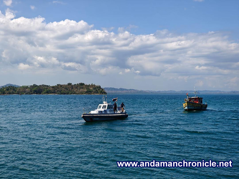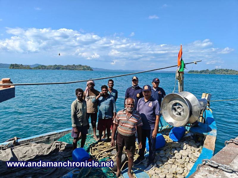 After conducting a systematic search operation in the surrounding waters, the disabled fishing trawler M.V. Sarveshwaran (IND-AN-SA-MM-2050), carrying five crew members, was successfully located. The crew reported that the vessel had suffered a gear box burst at around 0300 hrs while engaged in fishing at sea, following which it lost propulsion and continued drifting towards Oliver Island.