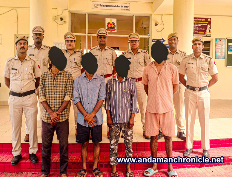 Sri Vijaya Puram, Dec. 3: In a major crackdown against drug peddling, the Police Station Pahargaon successfully apprehended four individuals involved in illegal trade of narcotic drugs on 23/11/2025 and seized 28 grams of methamphetamine along with Rs 27000/-.