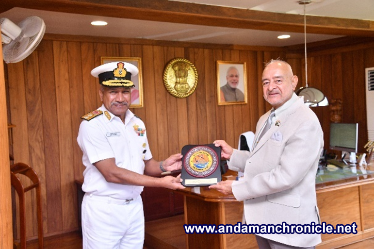 Sri Vijaya Puarm, April 9: RAdm Alok Ananda, YSM, Flag Officer Commanding, Eastern Fleet, Indian Navy called on Admiral D K Joshi, PVSM, AVSM, YSM, NM, VSM, (Retd.), Hon’ble Lt. Governor, A&N Islands and Vice-Chairman, Islands Development Agency today at Lok Niwas during the deployment of Indian Navy-Eastern Fleet in Andaman and Nicobar Islands water.