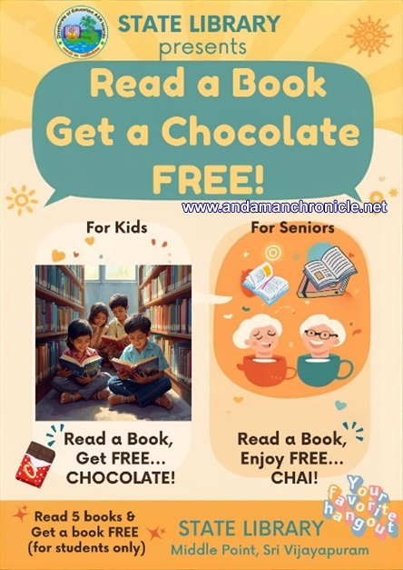 Sri Vijaya Puram, Nov. 11: The State Library has launched a special initiative to encourage and nurture reading culture among children and senior citizens. To make reading a more enjoyable and rewarding experience, the library is introducing a unique ‘Read a Book, Get a Gift Free’ program. Under this initiative, senior citizens will be welcomed with complimentary tea, while children will receive chocolates as tokens of appreciation for their love for reading. This program aims to create a warm, inviting, and motivating environment that inspires exploring the joy of reading with small but meaningful rewards. By introducing this unique incentive, the library hopes to nurture lifelong reading habits among people of all ages.
