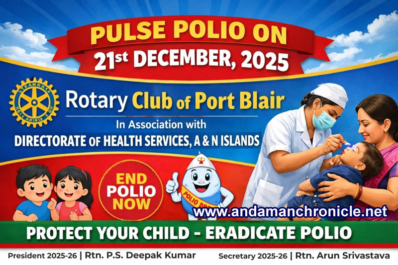 Sri Vijaya Puram, Dec. 18 (Report: Dr. Dinesh): The Rotary Club of Port Blair, in association with the Directorate of Health Services, Andaman & Nicobar Islands, will be an active part of the Pulse Polio Programme on 21st December, 2025, reaffirming a shared commitment to protect every child from polio.