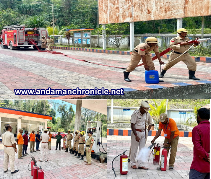 Kadamtala, April 26: A mock fire drill was successfully conducted by Fire Station Baratang at ANIIDCO Petrol Pump, Baratang, to assess emergency response, firefighting efficiency, and staff coordination. The scenario involved a fire at the fuel dispenser line during diesel refilling into a 40 KL underground tank. On receiving the call at 0955 hrs, the team responded within a minute and reached the site by 0958 hrs, demonstrating a swift response.