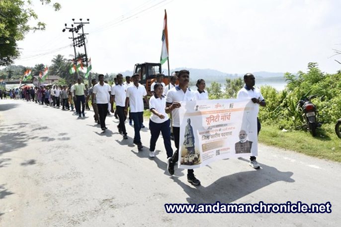 Mayabunder, Nov. 8: As part of the 150th Birth Anniversary of Sardar Vallabhbhai Patel, a special commemorative programme was jointly organized by Mera Yuva Bharat (MY Bharat), and the District Administration, North & Middle Andaman, at Mayabunder today. The event began with a padyatra (Unity March) from Danapur Junction to the Mini Stadium, Mayabunder Bazaar.