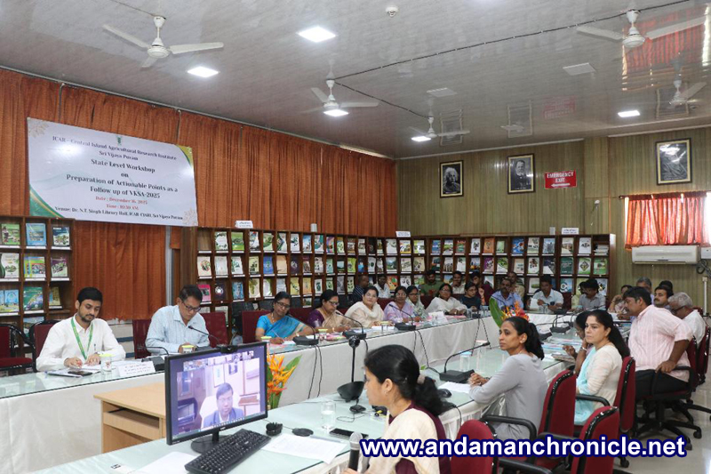 Sri Vijaya Puram, Dec. 16: ICAR-Central Island Agricultural Research Institute, Sri Vijaya Puram conducted a State Level Workshop on Preparation of Actionable Points as a Follow up of VKSA-2025 on 16/12/2025. During the inaugural programme, Dr. A.K. Nayak, Deputy Director General (Natural Resource Management), ICAR, New Delhi highlighted the importance of this workshop in preparing the roadmap for development of agriculture in the vulnerable island ecosystem. He suggested considering water resources, soil resources and biodiversity in the islands while developing the plan so that the sustainability is ensured without affecting the farm profits. He advised assessing the farmers’ requirements of various farm inputs, seed/ planting material, propagules of native breeds of fish and animals by involving the state functionaries so that the realistic projections and targets could be set.
