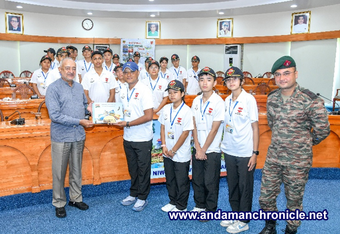 Sri Vijaya Puram, Nov. 5: Group of 20 students from PM SHRI Govt. High School, East Sikkim, during their visit to A&N Islands as part of National Integration Tour (NIT) called on Admiral D K Joshi, PVSM, AVSM, YSM, NM, VSM, (Retd.), Hon’ble Lt. Governor, A&N Islands and Vice-Chairman, Islands Development Agency today at Raj Niwas. The tour is organized by Indian Army under Operation Sadbhavana to foster educational exposure and cultural exchange.
