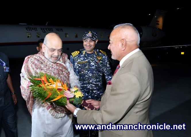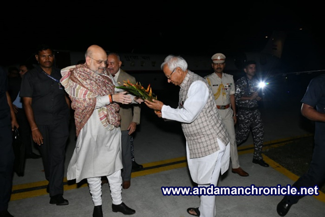 Sri Vijaya Puram, Jan. 2: Hon’ble Union Home Minister and Minister of Cooperation, Shri Amit Shah arrived on visit to A&N Islands today. On arrival, at Veer Savarkar International Airport, Sri Vijaya Puram, he was received by Admiral D. K. Joshi, PVSM, AVSM, YSM, NM, VSM (Retd.), Hon’ble Lt. Governor, Andaman & Nicobar Islands and Vice Chairman, Islands Development Agency, along with Hon’ble Member of Parliament, A&N Islands, Shri Bishnu Pada Ray, Chief Secretary, A&N Administration, Dr. Chandra Bhushan Kumar, IAS, Director General of Police, Shri Hargobinder Singh Dhaliwal, IPS, senior officers of the Andaman & Nicobar Administration, public representatives and others.
