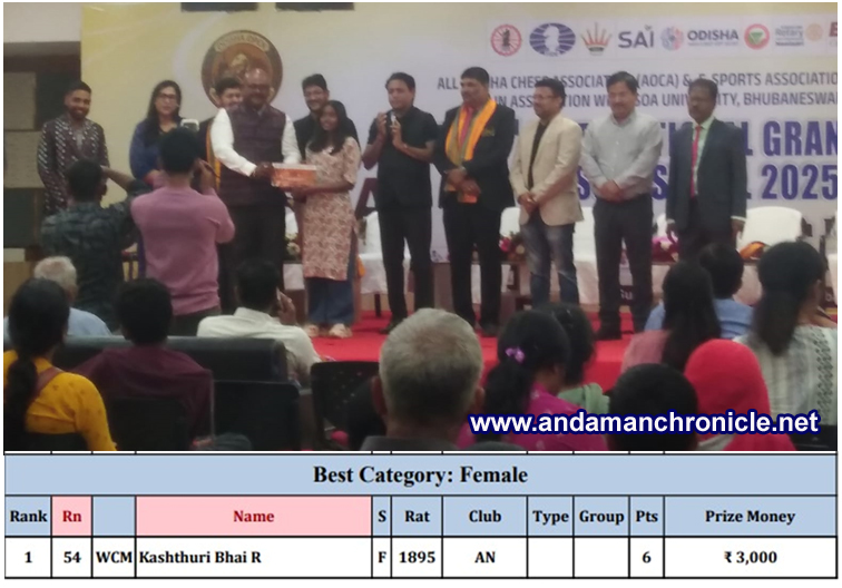 Sri Vijaya Puram, Jan 21: WCM, R. Kasthuri Bhai, chess prodigy from the Andaman & Nicobar Islands, won the Best Female Player prize along with a cash award at the Odisha Open Blitz Chess Tournament 2026, held at SOA University, Bhubaneswar, yesterday. She delivered an impressive performance and scored 6 points out of 9 rounds against strong competition, adding another feather to her cap.
