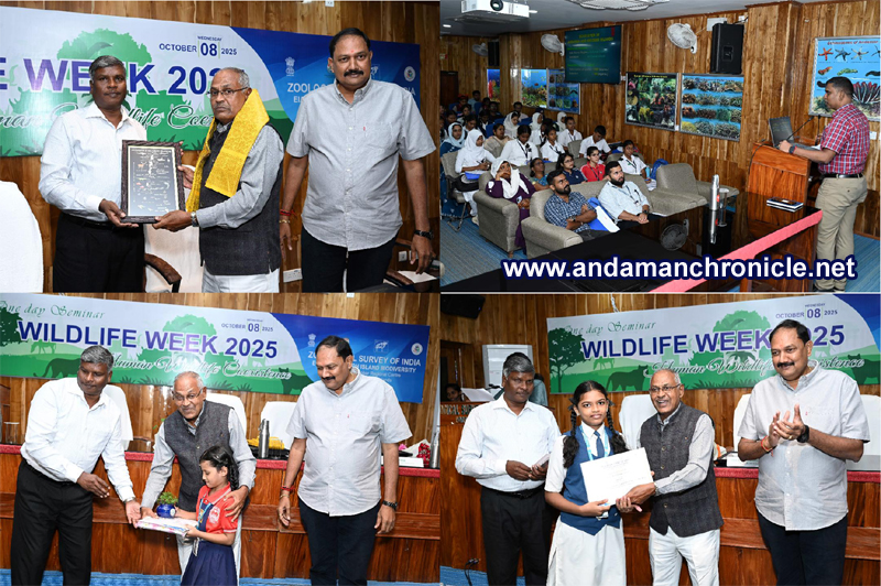 Sri Vijaya Puram, Oct. 8: As part of Wildlife Week 2025, the Zoological Survey of India (ZSI) and EIACP Centre on Island Biodiversity, Andaman & Nicobar Regional Centre organized a series of events from 2nd – 8th October 2025, which includes Storytelling, Quiz competition, Drawing competition, Nature walk (Butterfly & Bird watching), Plantation drive, Wildlife awareness rally and a one day seminar; engaging over 390 participants across the islands, under the theme “Human Wildlife Coexistence”.